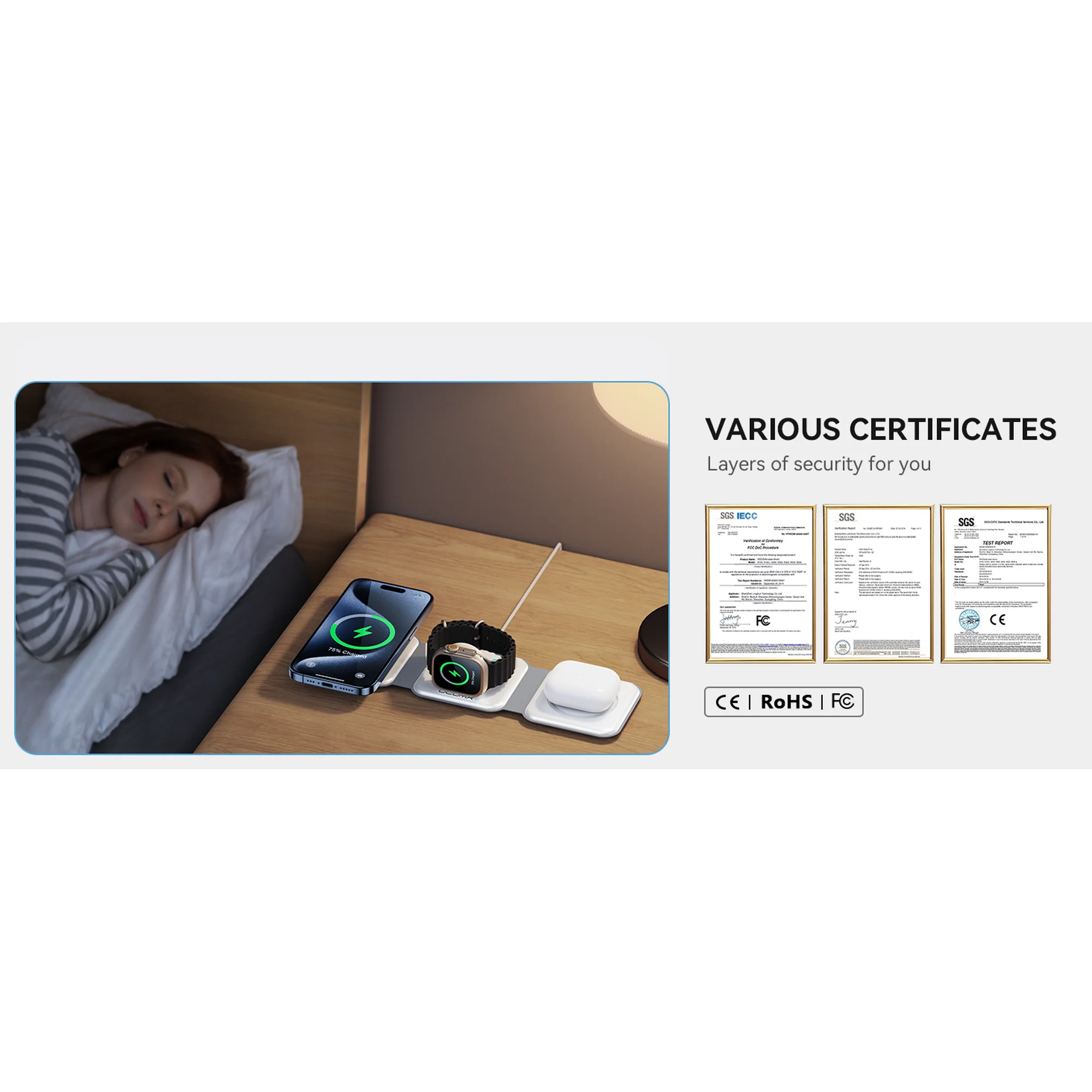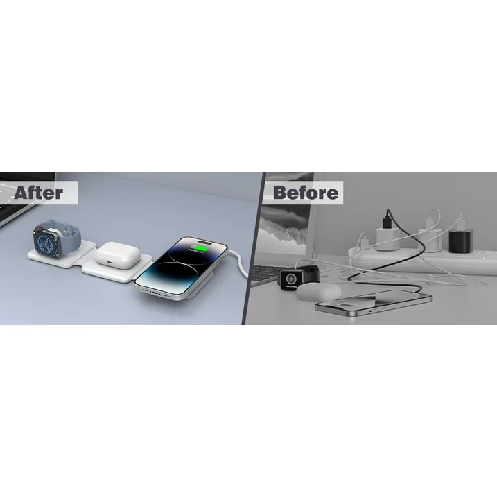 Charge your iPhone, Apple Watch, and AirPods at the same time with one compact station—keep your desk tidy and cable-free. 18W fast charger included.