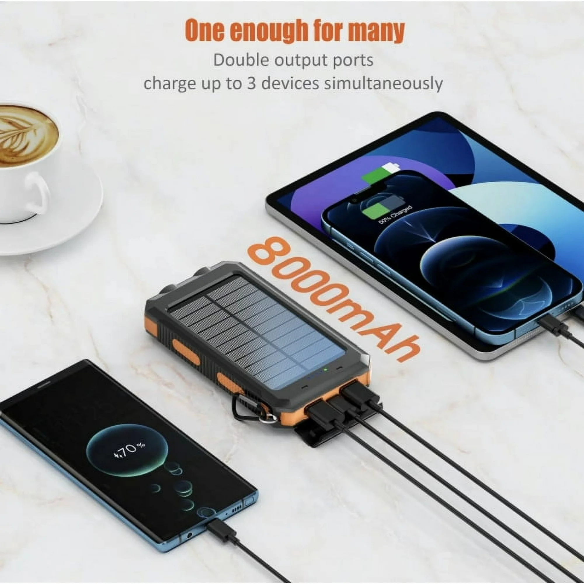 Built-in high-efficiency solar panel absorbs sunlight to recharge on the go—ideal for long outdoor trips without access to outlets. 8000mAh capacity provides multiple phone charges for camping, hiking, and emergencies.
