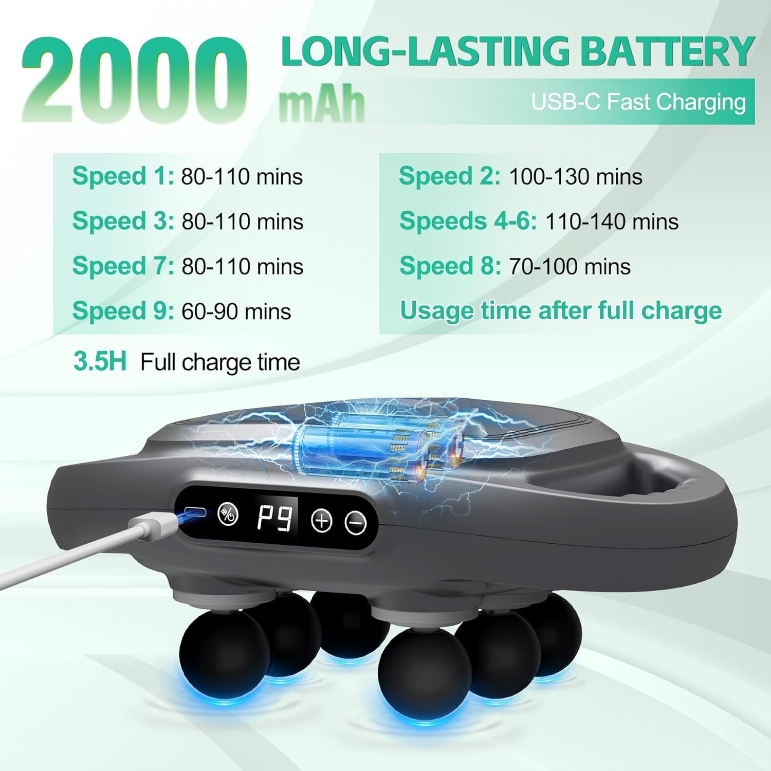 Low-noise operation for home, office, or gym use. 2000mAh battery delivers up to 2 hours of continuous massage. Built-in 10-minute auto shut-off adds safety and peace of mind.