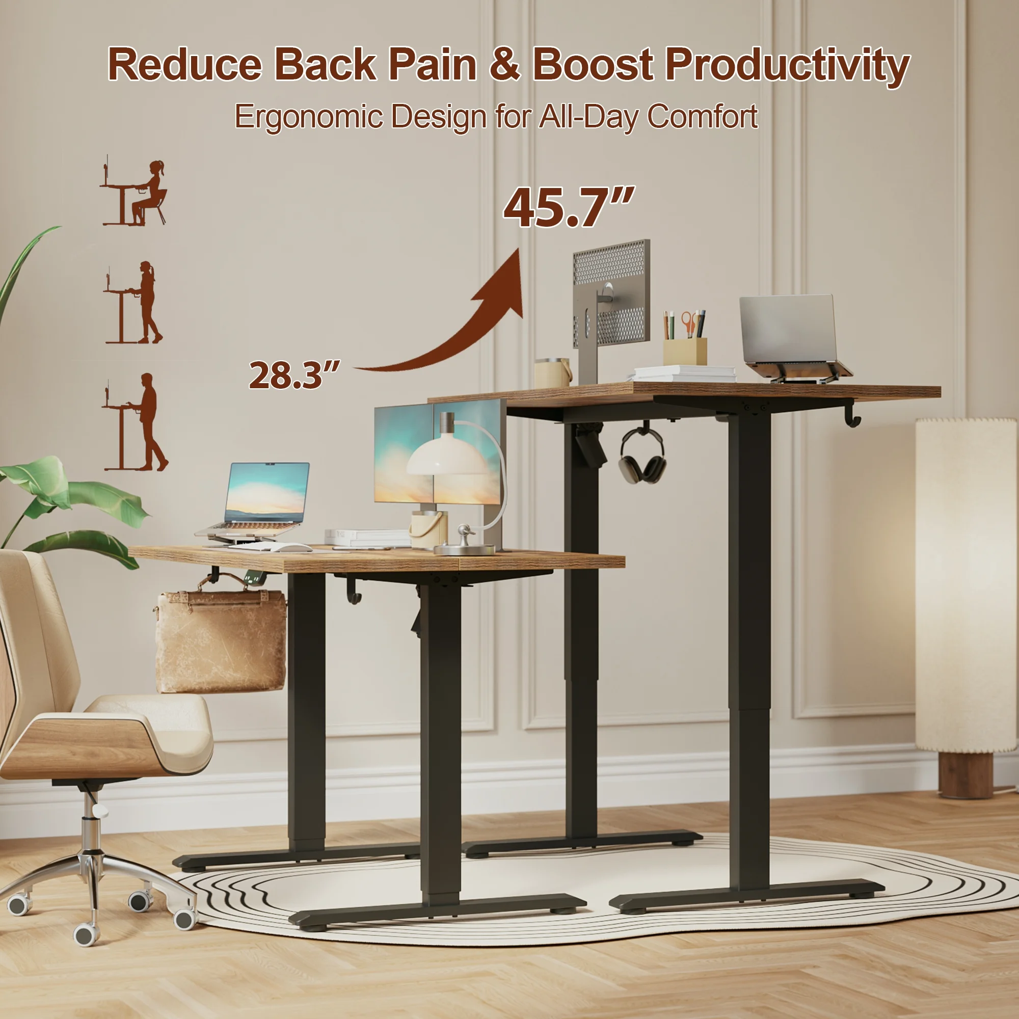 Smooth and Quiet Lifting: Equipped with a powerful motor, this adjustable desk lifts smoothly without shake or wobble to ensure stability for up to 110 lbs. The adjustable height desk operates at a quiet 55 dB noise level, making it ideal for both home and office environments.