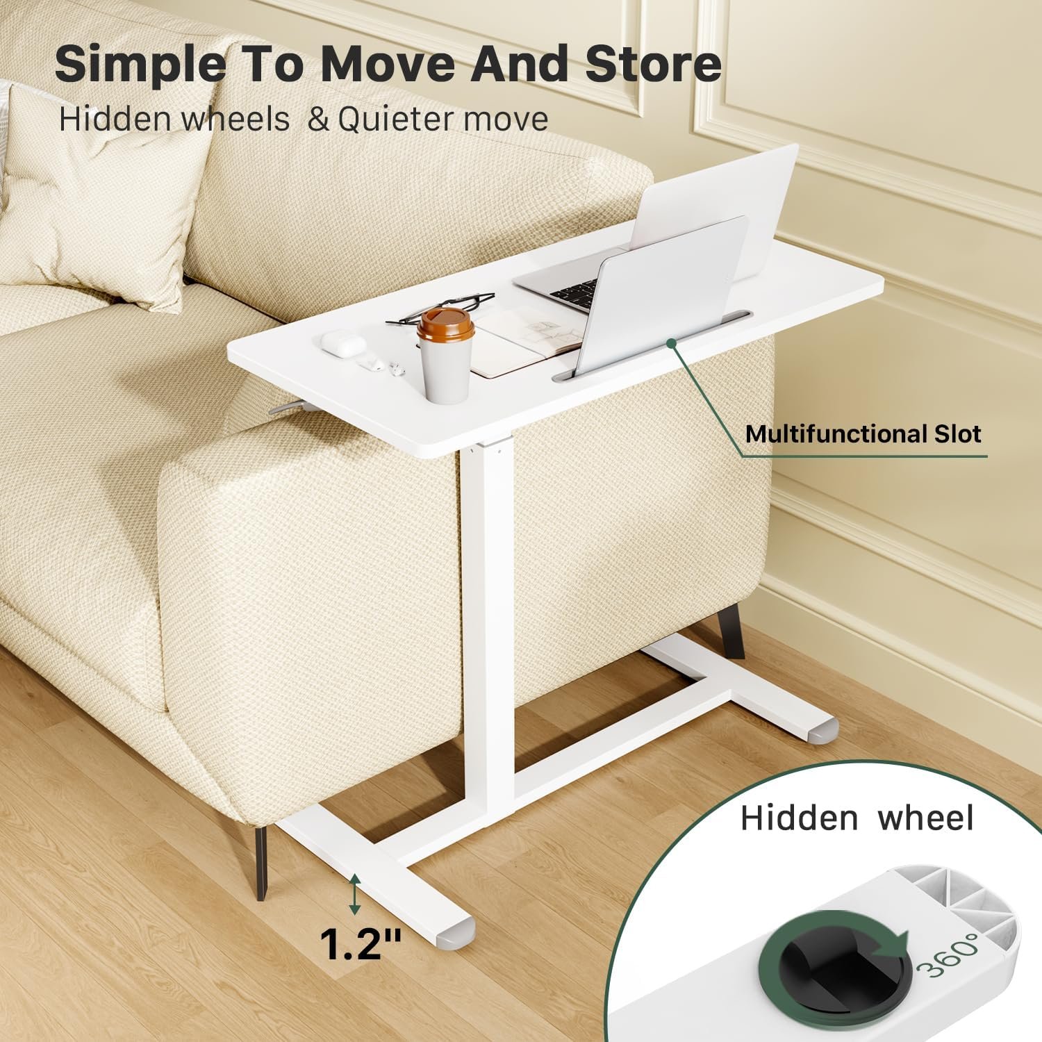 Equipped with 4 hidden smooth-rolling casters and a low-profile base (only 1.2″ clearance), the desk easily slides under sofas or beds—perfect as a couch desk, bedside table, or recovery cart.